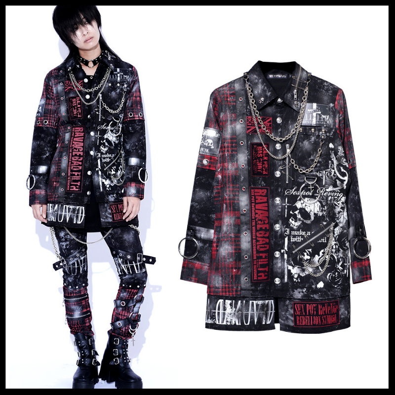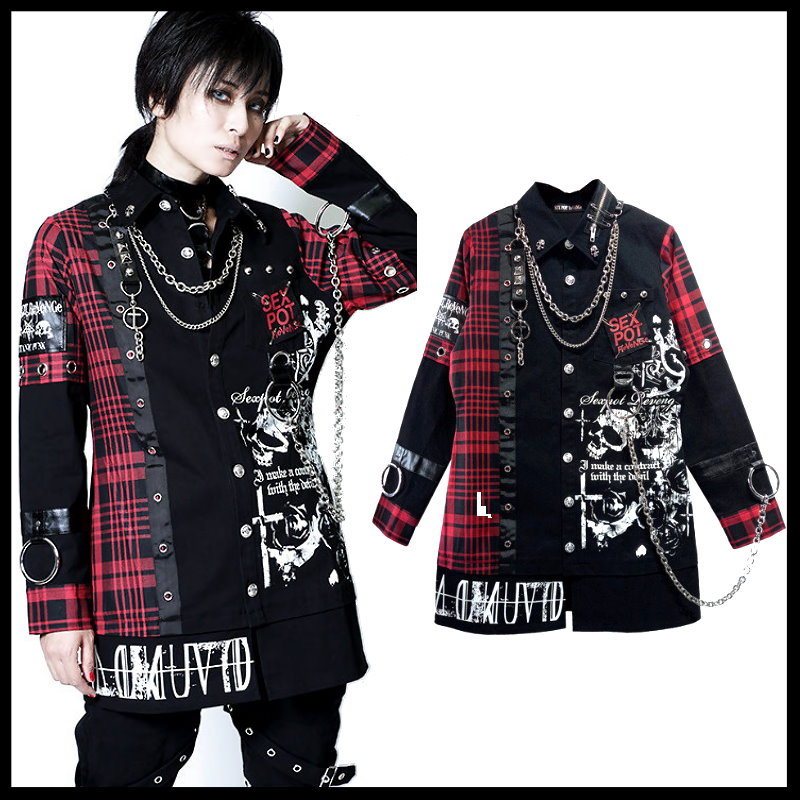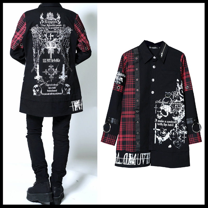 *MINI PUNK LOLO*日本龐克視覺-十字架を中心に、鎖と骨の両腕が広がる。権威と退廃を象徴する荘厳なゴシックグラフィック格紋拼接龐克襯衫(中性.sb02090)PUNK
