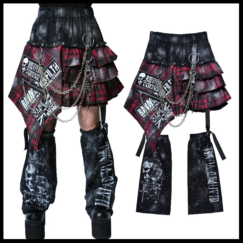 *MINI PUNK LOLO*日本龐克視覺-【パンキッシュ ブラック フリル スカート&レッグウォーマー】格紋不對稱荷葉邊龐克短裙+腿套(中性.SC01173)SEX POT